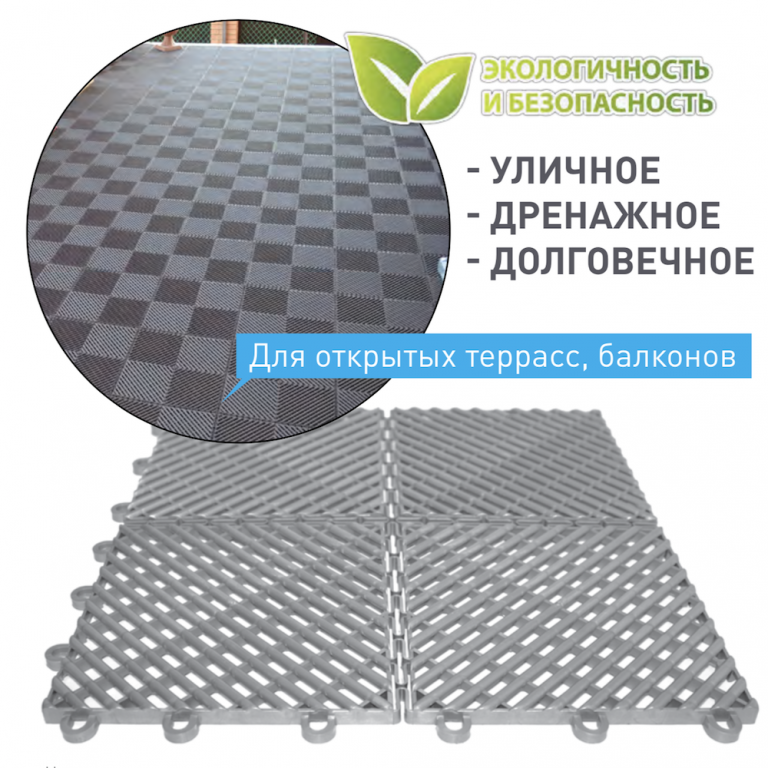 Дренажная структура модулей не дает воде скапливаться на поверхности, и даже после дождя покрытие остается практически сухим.